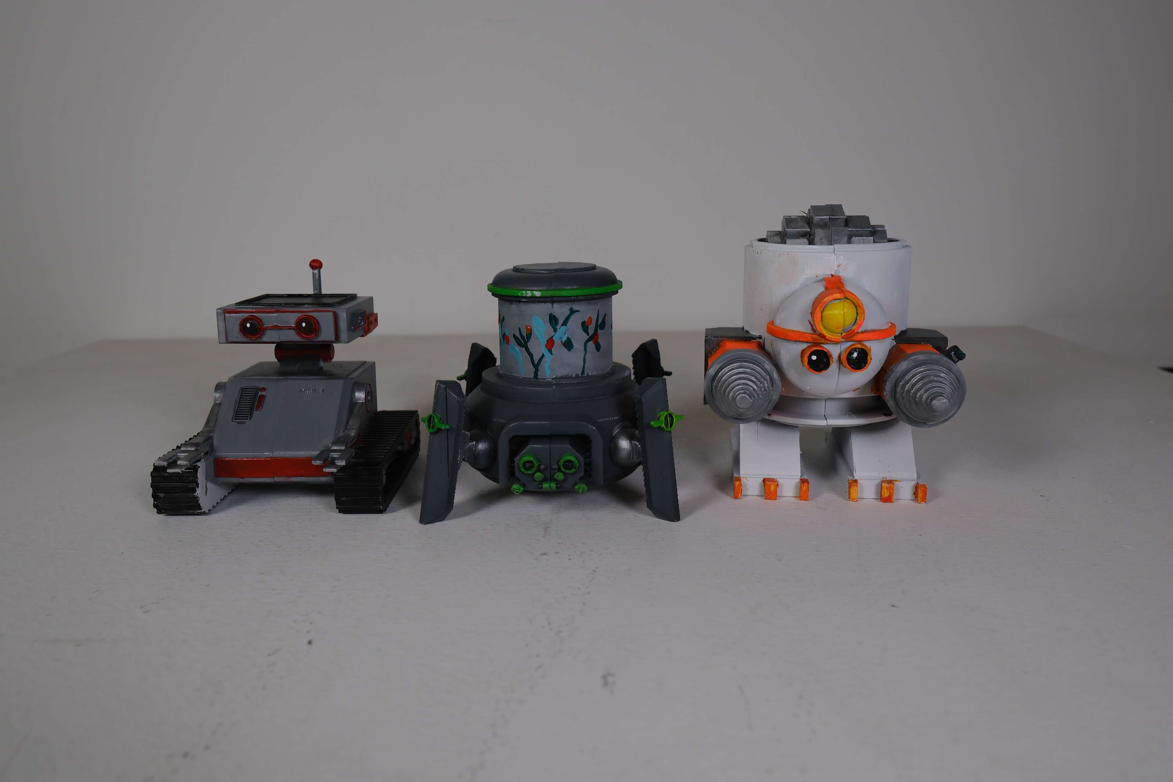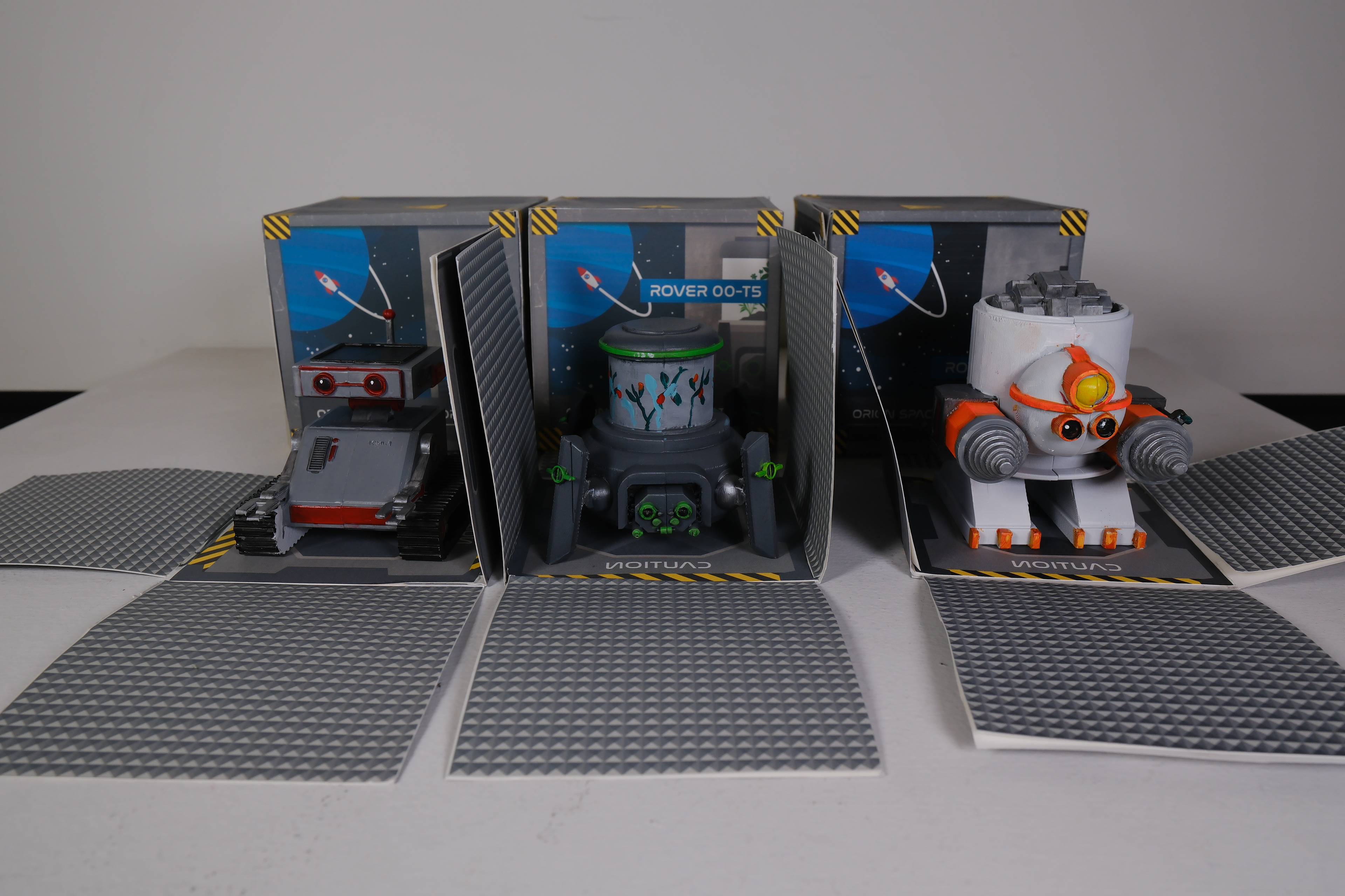 CONCLUSION: Above is the final product with the packaging design, and the three fabricated robots that were also painted. This project showed the design process from start to finish of the creation of a toy robot, its 3D modeling and fabrication, as well as the designing of the packaging that goes with the toy.